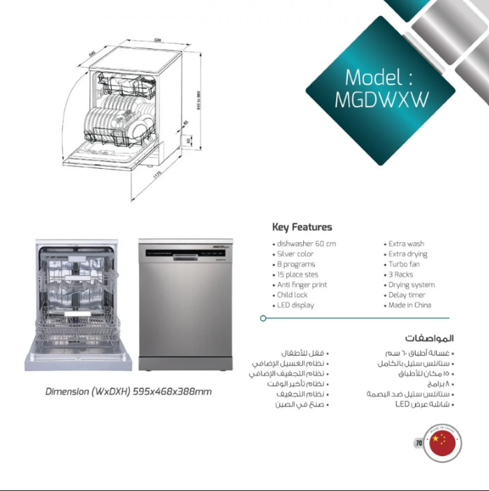 مواصفات غسالة صحون ماستر جاز 15 مكان 8 برامج 60 سم MGDWXW :