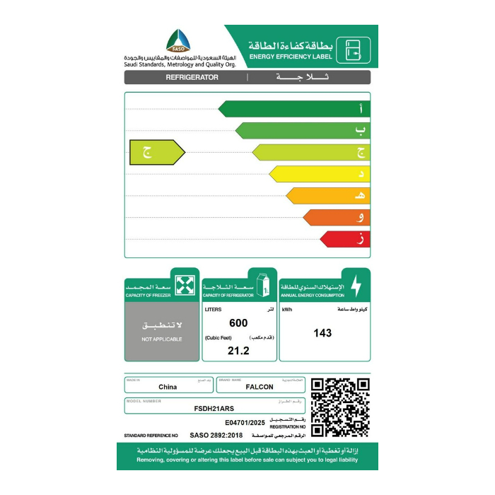 مميزات ثلاجة باب واحد فالكون 21.2 قدم – فضي FSDH21ARS :