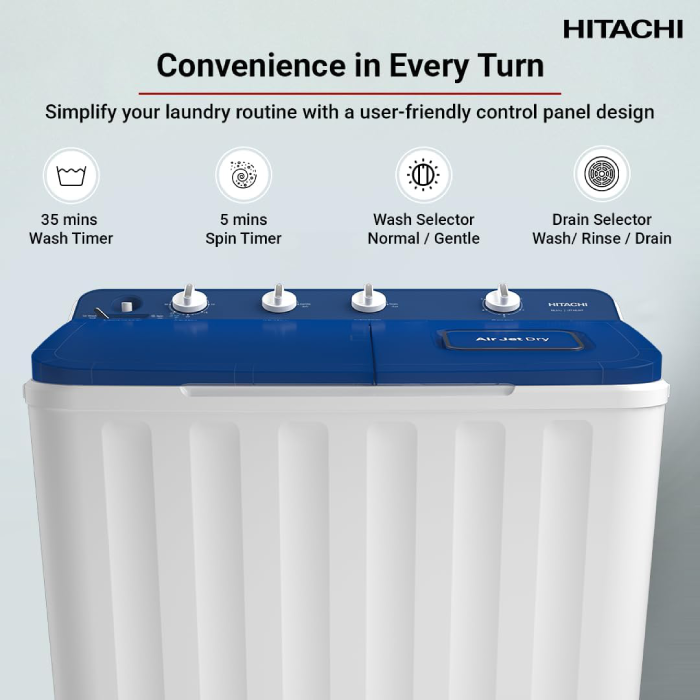 هل تبحث عن غسالة تجمع بين القوة، الكفاءة، والتصميم العصري؟ غسالة هيتاشي ذات الحوضين 10.5 كجم هي الحل الأمثل لجميع احتياجات الغسيل اليومية لأسرتك، بتصميم أنيق بلون أبيض نقي مع غطاء أزرق عصري يضيف لمسة جمالية لمطبخك أو مكان الغسيل.