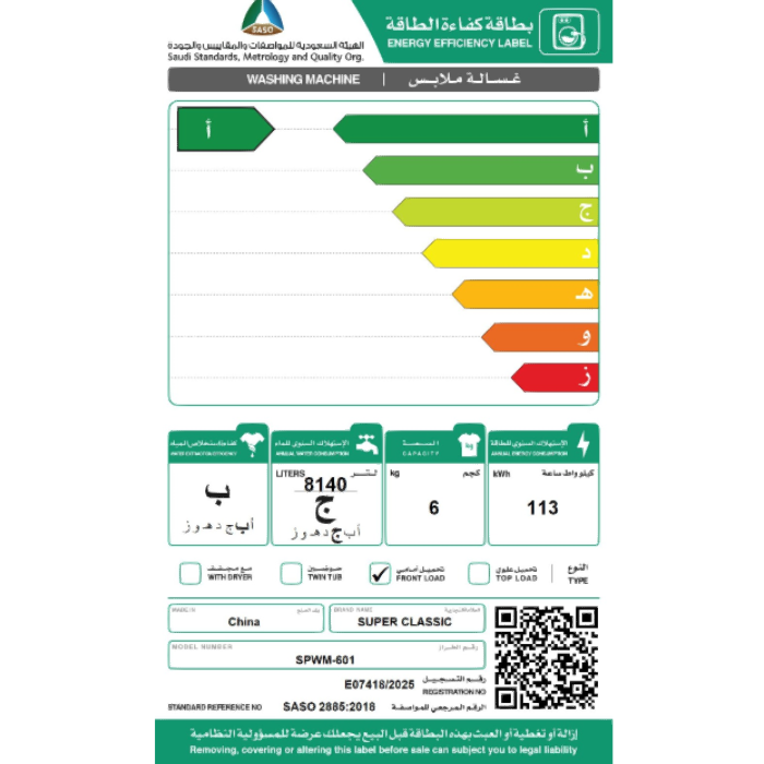 مواصفات غسالة ملابس أمامية سوبر كلاسيك 6 كيلو – فضى SPWM-601 :