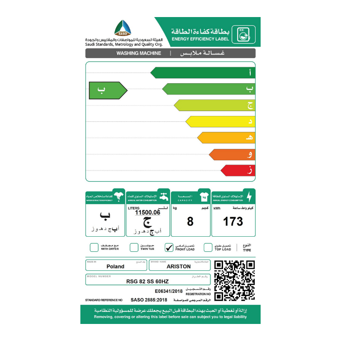 مميزات غسالة ملابس امامية اريستون 8 كيلو 1200 لفة/د فضي RSG82SS :