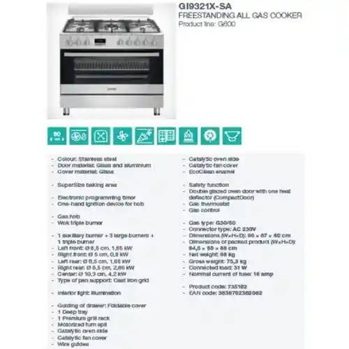 GI9321X-SA بمقاس 60×90 سم هو الحل الأمثل لمطبخك العصري. مزود بـ 5 عيون طهي عالية الأداء، نظام تحكم ديجيتال ذكي، وحوامل ثقيلة من الحديد الزهر لضمان ثبات الأواني وتوزيع حرارة مثالي. صُنع بدقة تركية عالية مع مواصفات الجودة الأوروبية، ليمنحك تجربة طبخ آمنة، اقتصادية، واحترافية كل يوم.| العلامة التجارية |
