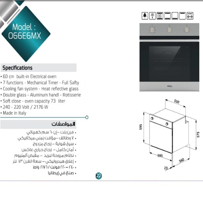 مواصفات فرن كهرباء بلت ان ماسترجاز 60 سم 7 وظائف بمروحة إيطالي O66E6MX :