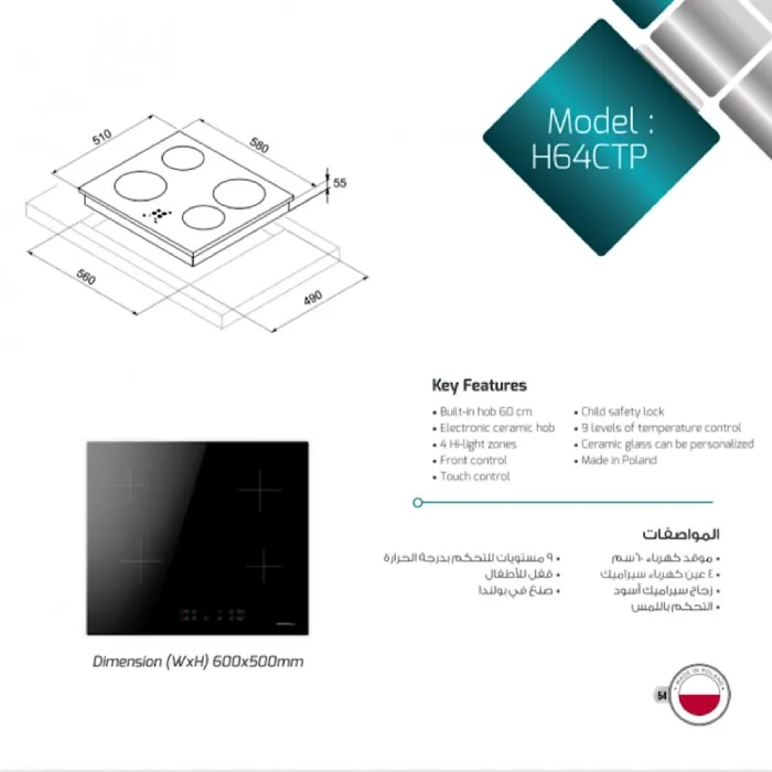 مميزات موقد كهربائي مدمج سيراميك ماسترجاز 4 عيون 60 سم بولندي H64ctp :