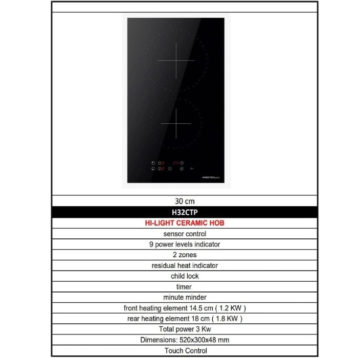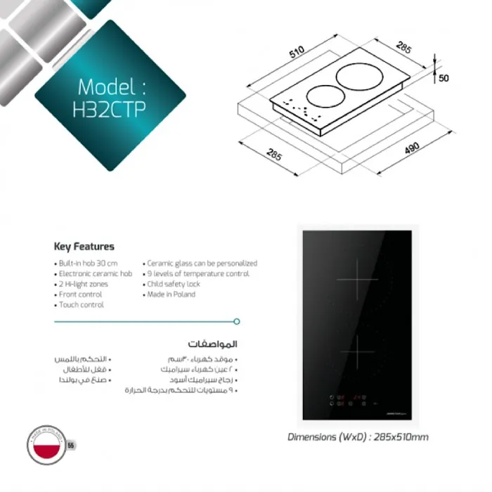 مميزات موقد كهربائي مدمج ماسترجاز 30 سم 2 عين سيراميك بولندي H32ctp :